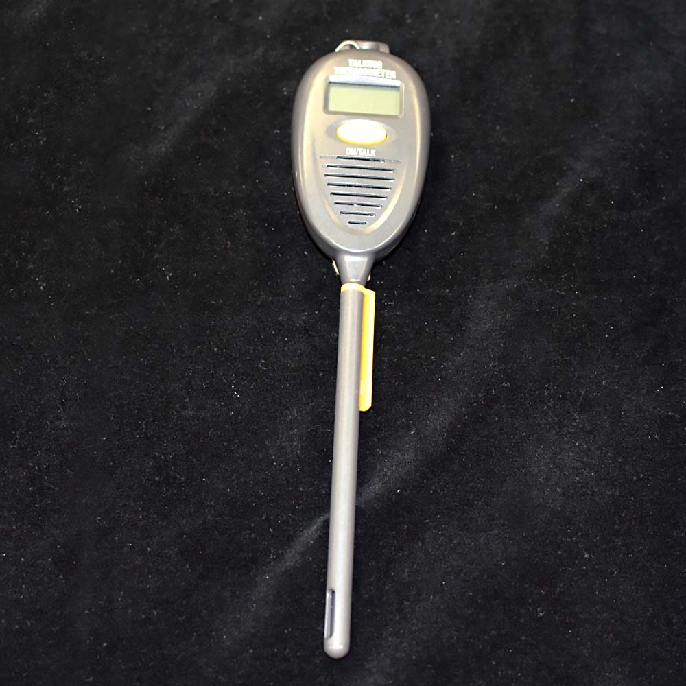 Insert the probe of this thermometer into what you are cooking and check the temperature at the touch of a button; the result is spoken and displayed in 3/8-inch tall numerals on an LCD screen. This digital talking thermometer can be used for cooking, candy making, bath water, gardening, and hobbies. It measures temperatures ranging from -58 to 572 degrees Fahrenheit (-50 to 300 degrees Celsius) with a variance of +/- 1.8 degrees Fahrenheit (+/- 1 degree Celsius) over most of its range. The probe is 4.9 inches long and the handle/readout area measures 4.4 × 2 × 1.2 inches. The unit features a power/talk button with automatic shut-off after ten minutes, a retention loop for hanging, and a probe cover with hanging clip. The unit uses two AAA batteries (included).