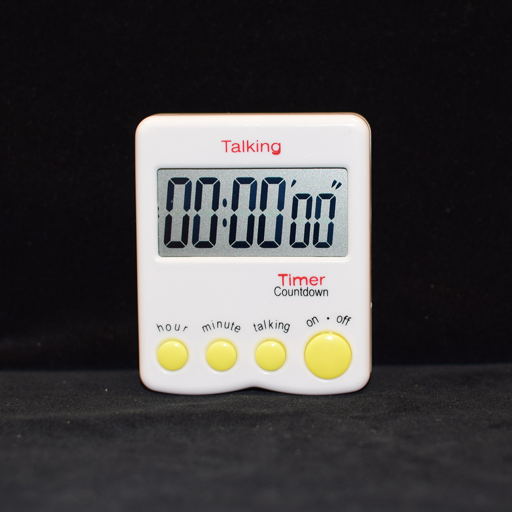 This twenty-four hour countdown timer has a loud, clear, female voice and distinctive alarm sound. All setting functions speak and you can find out to the second how much time remains by the press of a button. The hours and minutes are displayed in 3/4-inch-tall numerals on the LCD screen, while the seconds are 9/16 inch high. Measuring approximately 3 × 2 1/2 × 1/2 inches, the timer features astand. The timer also can be attached to a metal surface, or hung on a hook. It uses